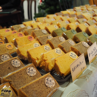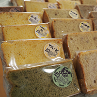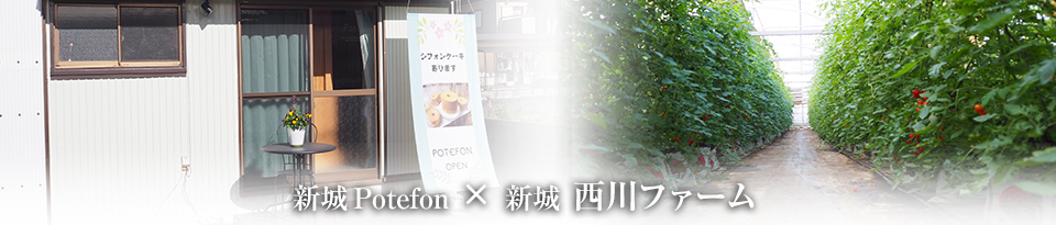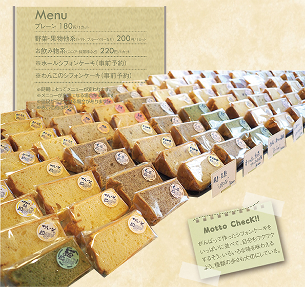 田畑が広がる新城市富岡にある、シフォンケーキのお店Potefon(ポテフォン)。村松靖江さんが実家の一部を改装し、令和7年7月にオープンした。会社員時代に、もらった手作りのシフォンケーキの美味しさに感動し「自分も作るようになると、皆さんが喜んでくれる笑顔がうれしかった」とお店を開く決意を硬め、会社を早期退職した。定番の味から季節の味を取り入れたシフォンケーキは、オープン時にずらりと15種類前後が並ぶ。「子どもたちが買いに来てくれる値段設定、自分が美味しいと思った素材を取り入れています。自分も農業をしているため、地元の素材も積極的に使っています」と村松さん。西川ファームさんも同じ富岡にあり、地元のコラボ商品。